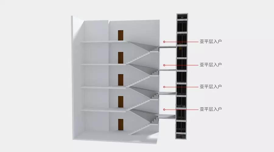 顧名思義,亞平層入戶 是指增設電梯后,電梯停靠層站在原樓層平層位置以下20cm至100cm亞平層位置處,使住戶所處的樓層平面和電梯停靠平面形成一個小高度差,在電梯出口平臺與住戶門入口之間做一個斜坡結構入戶通道覆蓋在原來上行樓梯上方,乘坐電梯到達相應樓層后,住戶可通過無障礙小斜坡直接入戶的方式。