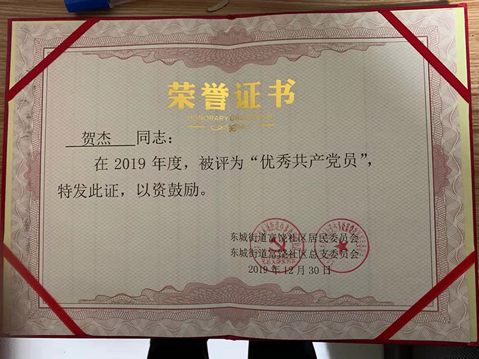 賀杰同志自2001年加入中國共產黨以來,處處以黨員的標準嚴格要求自己,以身作則,發揮了共產黨的先鋒模范作用。